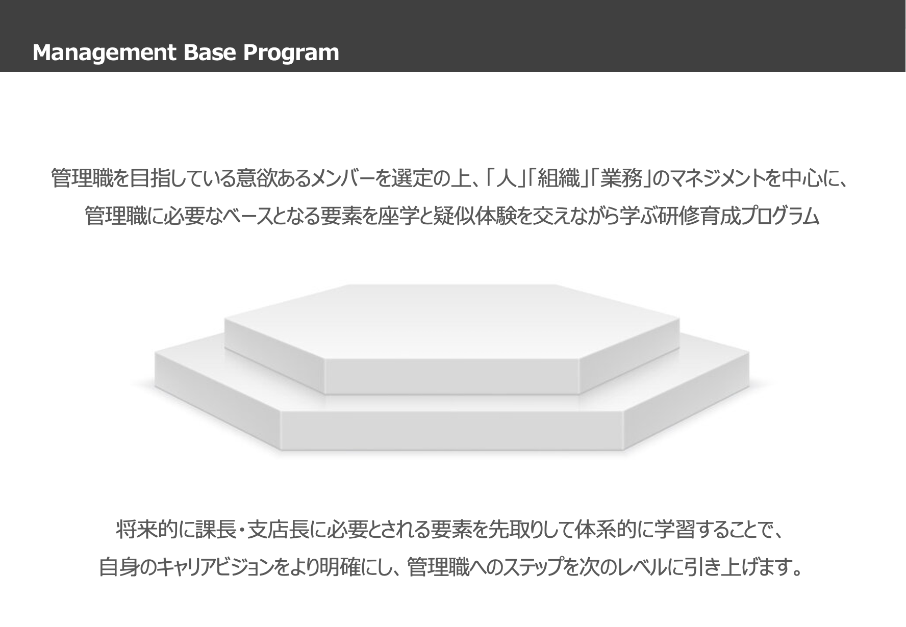 管理職に必要なベースとなる要素を座学と疑似体験を交えながら学ぶ研修育成プログラムとして「Management Base Program」を企画しました。