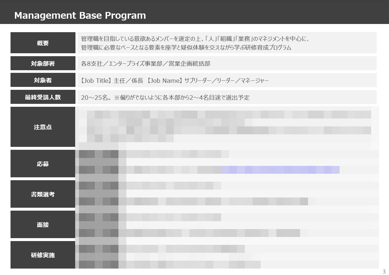 これまで管理職として必要なスキルを体系的に学べる場はなかったこともあり、管理職を目指す意欲あるメンバーを選定の上、「人」「組織」「業務」のマネジメントを中心に、